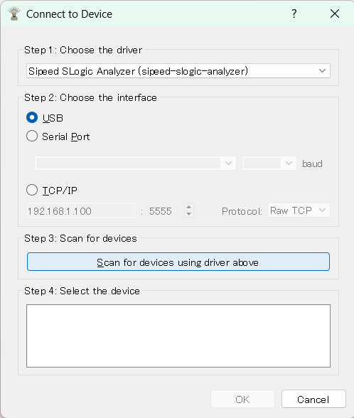 当初,USBハブ経由でSLogic 16U3を接続しましたが,Scanしても候補が表示されませんでした.次に,PCのUSBポートに直接接続したら,Scan後に表示されました(ただし,その後もう1度Scanしてみたら,表示されなかった….う,う~んSipeedよ…)