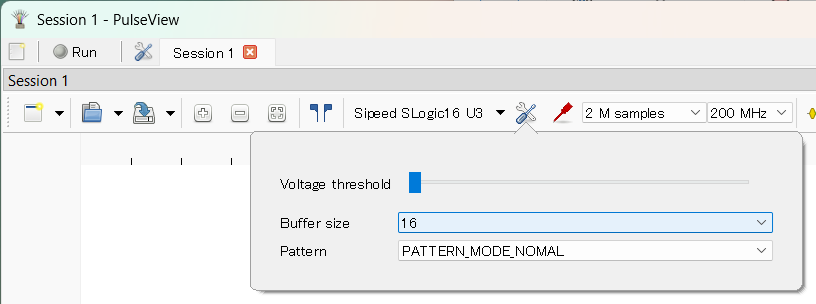 SLogic 16U3をUSBケーブルを使ってPCに接続したら,Pulseviewの画面で設定を開きます.Choose the driverのドロップダウンボックスには, ‘Sipeed SLogic Analyzer’ しかありません.